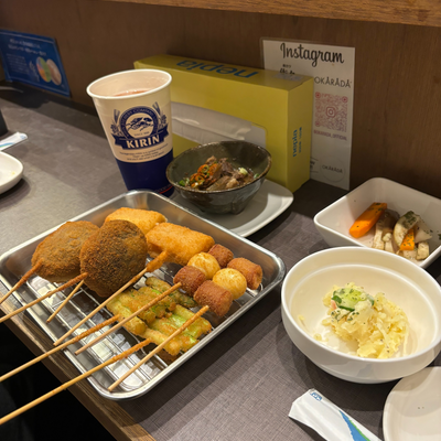 Kushikatsu Sakusaku opened as a sister shop to the bakery "Lapian," which was established in Esaka in1999 . You may wonder why a bakery started a kushikatsu (deep-fried skewer) shop. The reason is that Lapian, known for its additive-free bread, had long been struggling with bread waste. To address this issue and reduce waste, we decided to repurpose leftover bread into breadcrumbs for kushikatsu. Now, we have completely eliminated bread waste, and our kushikatsu has become so popular that it is even offered as a hometown tax return gift for Suita City. Additionally, we incorporate okara, a byproduct of tofu, into the batter to create a healthier version of kushikatsu. For vegan customers, they provide seasonal vegetable skewers, which can be enjoyed with special salts like matcha salt or curry salt.
