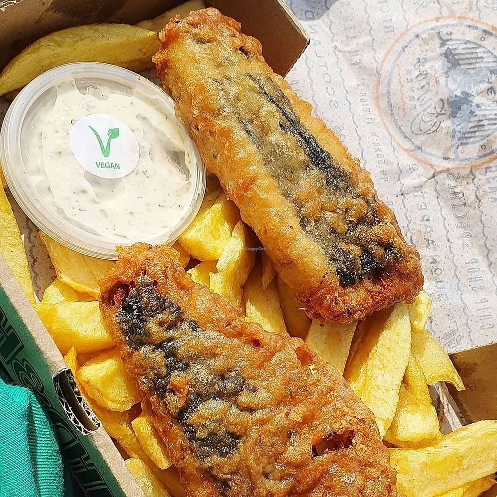 Comment from the community: “@fgfveganoshawa near Toronto 🇨🇦! They use banana blossoms and serve their vegan fish & chips with mushy peas and tartar sauce!”
