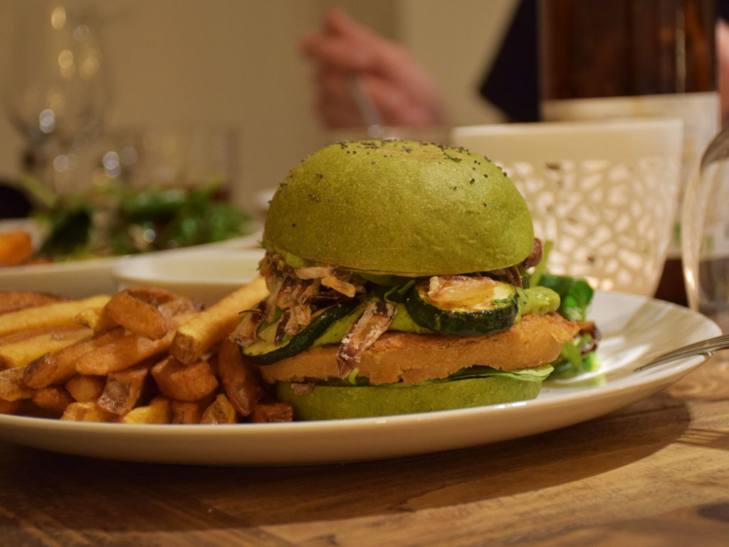Our favorite dish: the Green Burger with its chickpea and mushroom patty, caramelized onions and house-made sweet potato fries. Definitely worth a try!