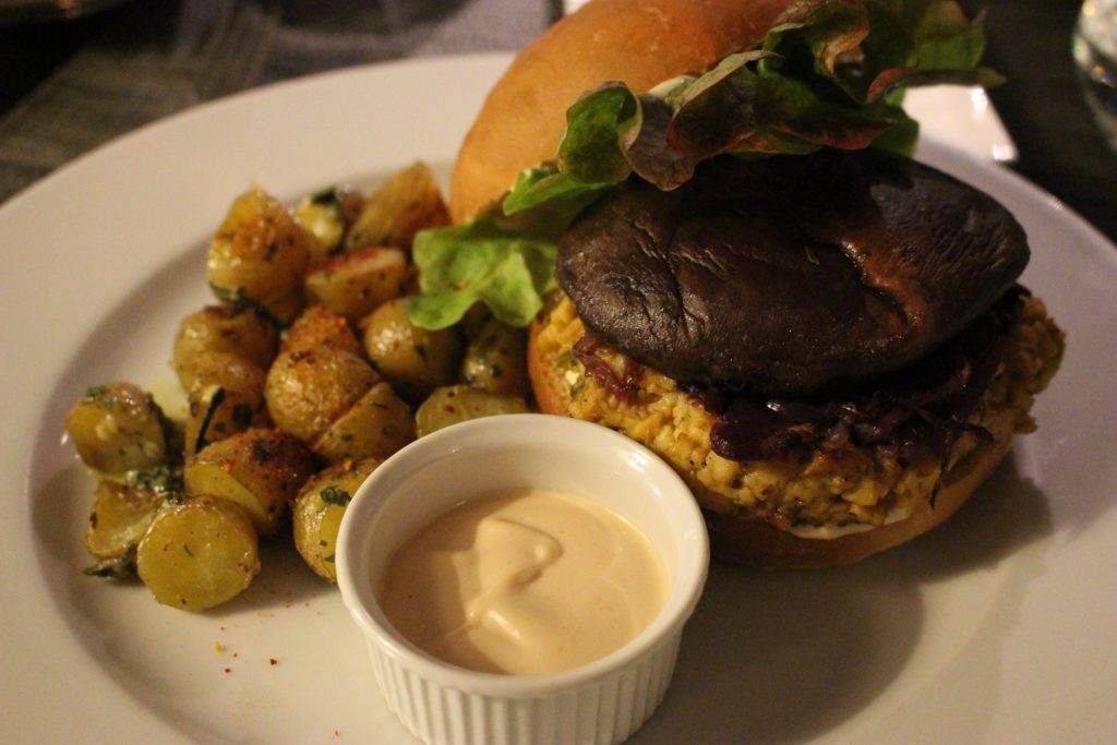 Our favorite dish: “The Famous” is a roasted Portobello mushroom burger, garnished with a pickled tempeh tartar, with a homemade mayonnaise (really delicious), served with baby potatoes sauteed (the best potatoes).