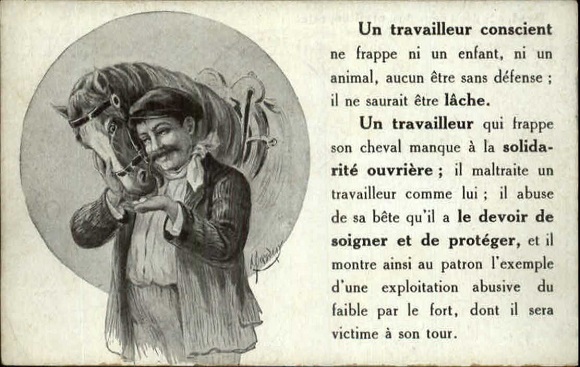 Un travailleur qui frappe son cheval manque à la solidarité ouvrière; il maltraite un travailleur comme lui; il abuse de sa bête qu’il a le devoir de soigner et de protéger, et il montre ainsi au patron l’exemple d’une exploitation abusive du faible par le fort, dont il sera victime à son tour.
