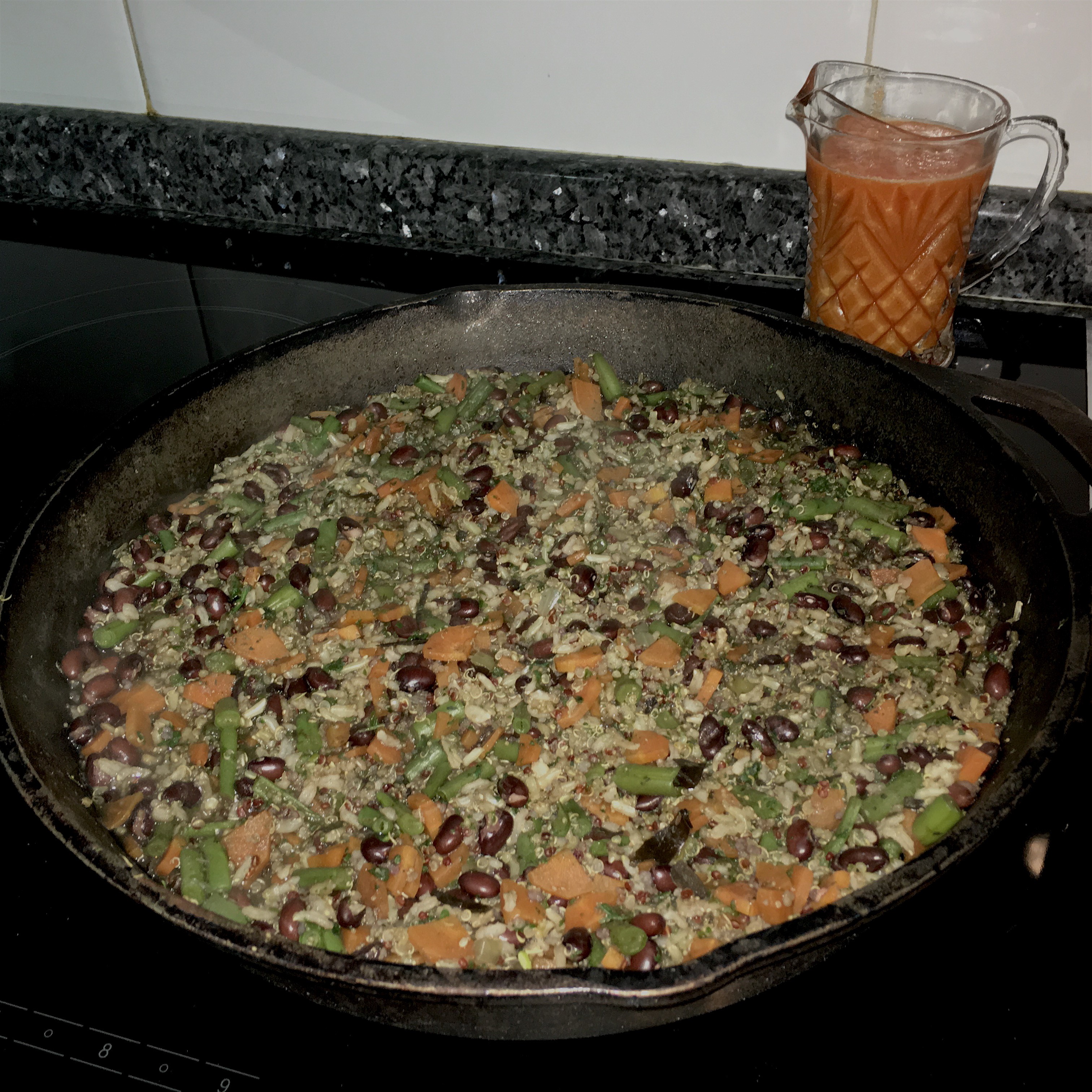 -Sauté carrots, green beans (if using) and onions in water, adding a little at a time, in a large iron skillet or other large frying pan.