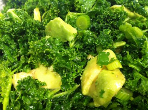 Massage the kale and the dressing ingredients together for about 2 minutes. The kale will collapse and the dressing will coat all the kale leaves.