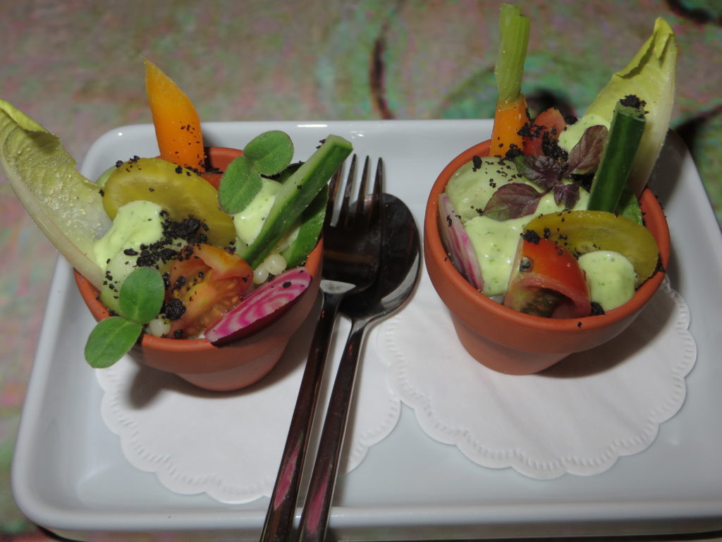 I was very pleasantly surprised when I got my first dish…tiny little flowerpots with crispy fresh greens and a lovely dressing. ‘Petit potagers’, so the speak. So creative and so tasty!