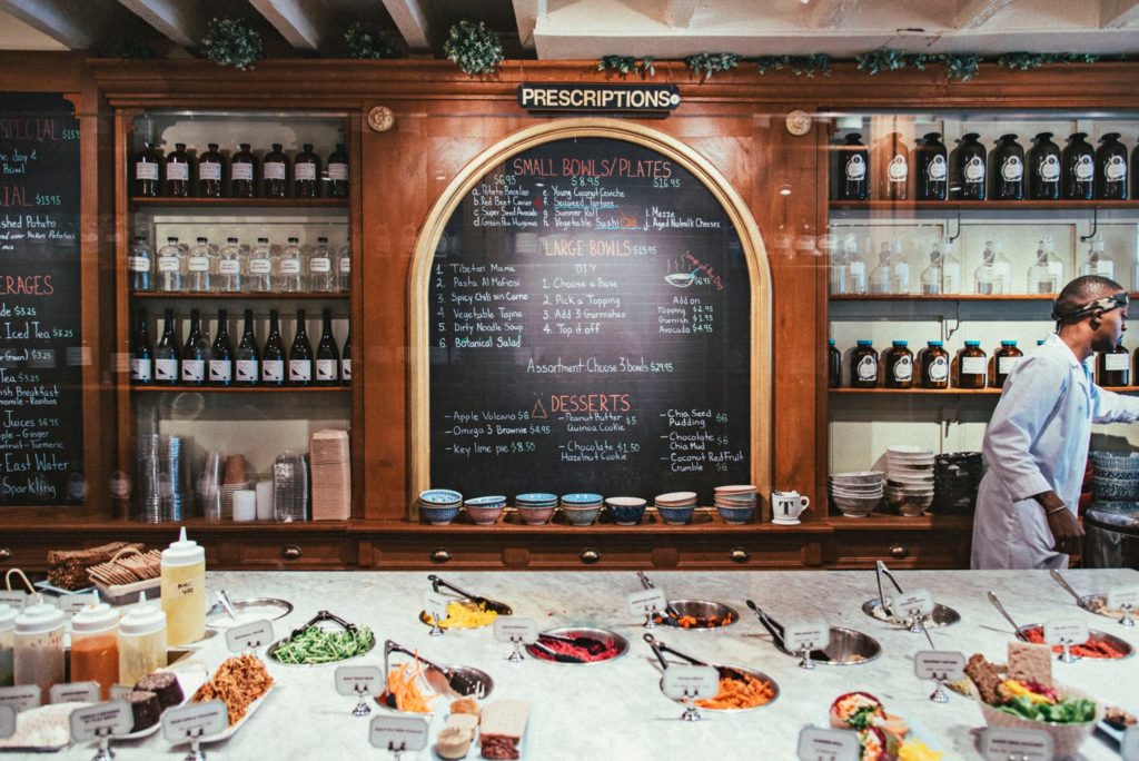 The restaurant looks like a classic apothecary including glass tincture bottles and white lab coats.