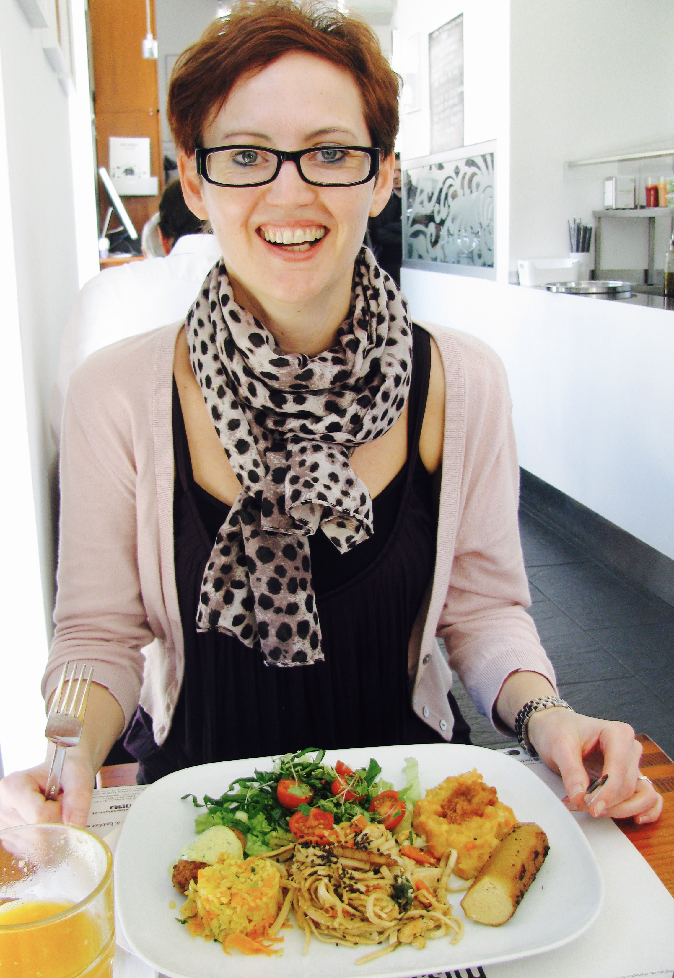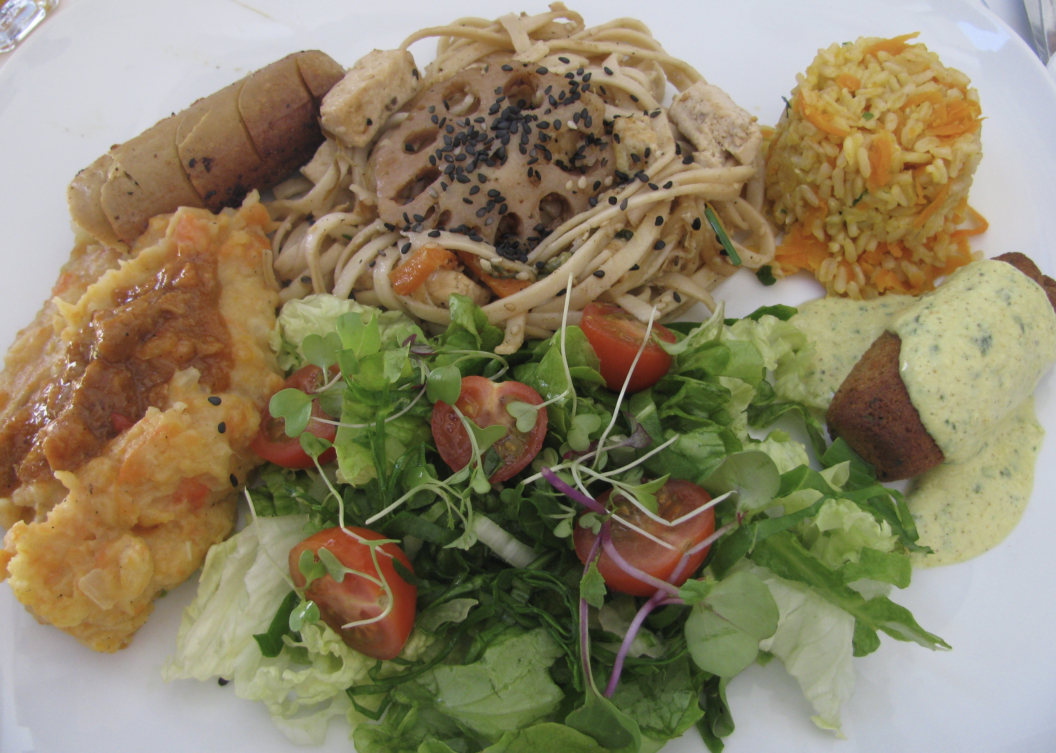 We enjoyed a great combination-platter. I am not fond of (and that’s putting it lightly) vegan ‘meat or sausages’ that taste like meat or have a smokey bacon flavor. So I skipped the sausages but everything else was of very high quality and of great taste!