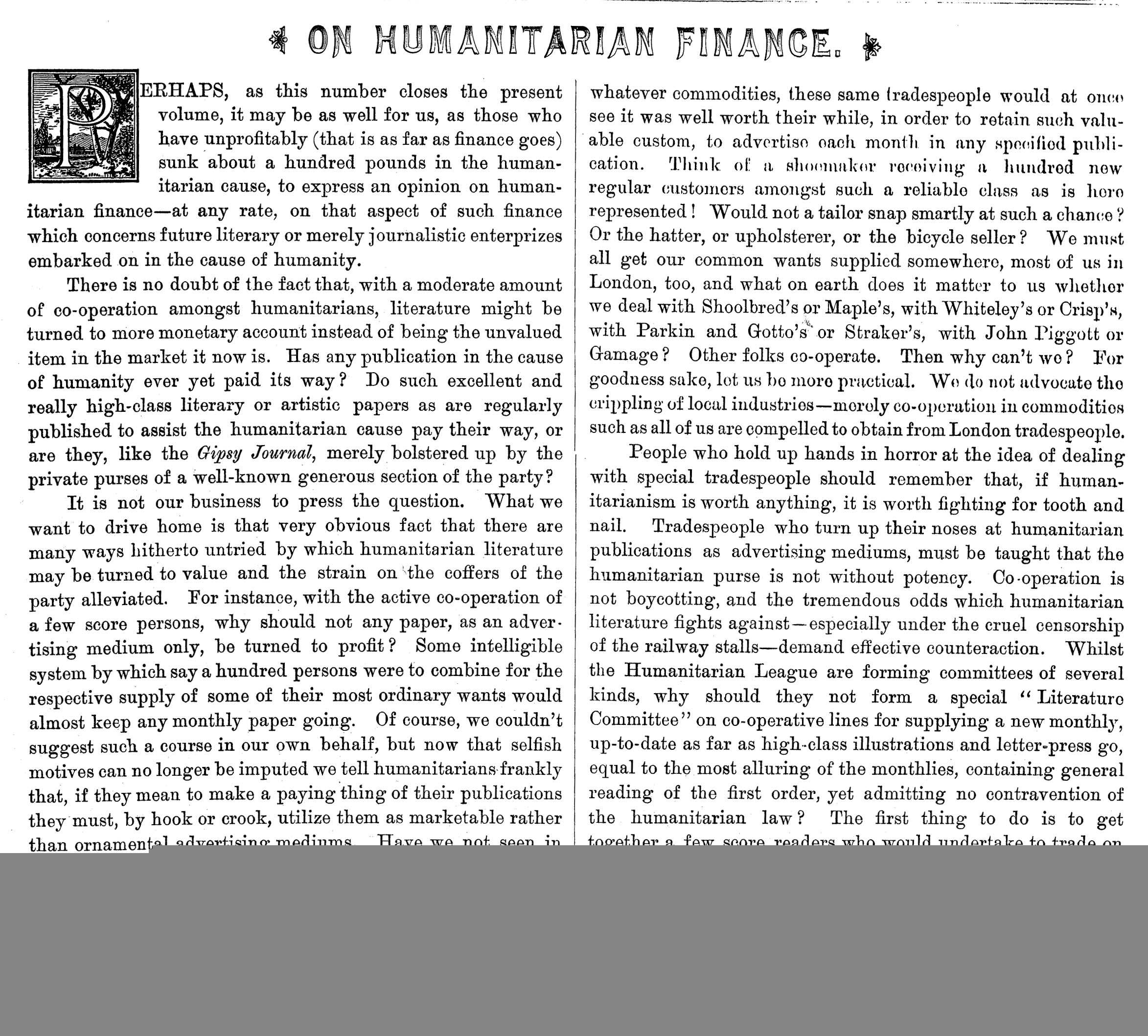 Perhaps, as this number closes the present volume, it may be as well for us, as those who have unprofitably (that is as far as finance goes) sunk about a hundred pounds in the humanitarian cause, to express an opinion on humanitarian finance – at any rate, on that aspect of such finance which concerns future literary or merely journalistic enterprises embarked on in the cause of humanity.