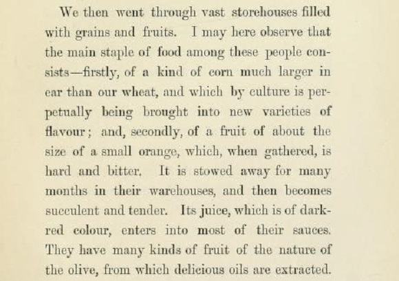 We then went through vast storehouses filled with grains and fruits. I may here observe that the main staple of food among these people consists — firstly, of a kind of corn much larger in ear than our wheat, and which by culture is perpetually being brought into new varieties of flavour; and, secondly, of a fruit of about the size of a small orange, which, when gathered, is hard and bitter. It is stowed away for many months in their warehouses, and then becomes succulent and tender. Its juice, which is of dark-red colour, enters into most of their sauces. They have many kinds of fruit of the nature of the olive, from which delicious oils are extracted.