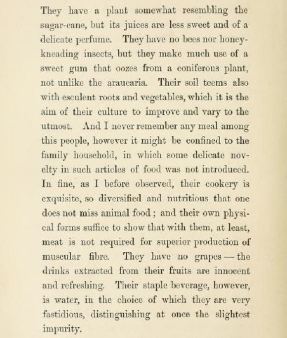 ……their cookery is exquisite, so diversified and nutritious that one does not miss animal food; and their own physical forms suffice to show that with them, at least, meat is not required for superior production of muscular fibre. They have no grapes — the drinks extracted from their fruits are innocent and refreshing. Their staple beverage, however, is water, in the choice of which they are very fastidious, distinguishing at once the slightest impurity. – The Coming Race – p220