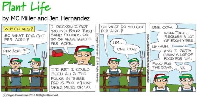 September 6, 2010 at 11:12 amThanks for sharing. Well not hilarious, this strip alludes to a poignant point about the wasting of resources on food animal when that same precious resource could go to feed hungry humans everywhere. And not to mention the environmental degradations that come from the farm animal industrial complex!