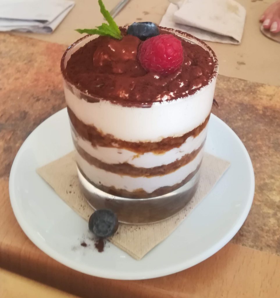 We couldn’t decide which dessert to try so we ordered 3! The cheesecake with blueberry jam, the vegbrownie with almond ice-cream and the vegamisú. Everyone loved the vegamisú the best.