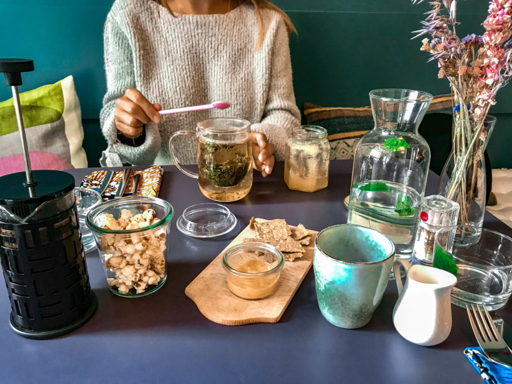A coconut cauliflower soup, banana bread, cold-pressed juices, peanut butter hummus, herbs