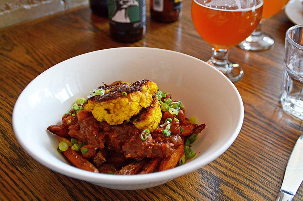 The menu features some interesting takes on english pub standards. There is no fake meat on the menu, which has led to the development of some surprisingly creative dishes. Their chana masala-topped fries, for example, were especially interesting and epically delicious, and their hearty lentil and ale pasty was a savoury bite of olde fashioned heaven.