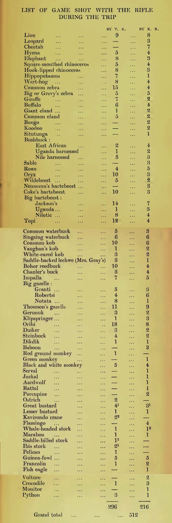 The total is 512, of which 43 are birds. The number of large animals killed, was 17 lion, 3 leopard, 7 cheetah, 9 hyena, 11 elephant, 10 buffalo, 11 (now very rare) black rhino and 9 White rhino. Most of the 469 larger mammals included 37 species and subspecies of antelopes.