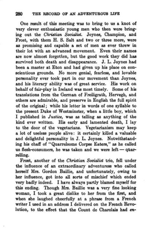 One result of this meeting was to bring to us a knot of very clever enthusiastic young men who then were bringing out the Christian Socialist Joynes, Champion, and Frost, with them H. S. Salt and two or three more, were as promising and capable a set of men as ever threw in their lot with an advanced movement. Even their names are now almost forgotten, but the good work they did has survived both death and disappearance. J. L. Joynes had been a master at Eton and had given up his place on conscientious grounds. No more genial, fearless, and lovable personality ever took part in our movement than Joynes, and his literary ability was of great service. ……… His early and lamented death, I lay to the door of the vegetarians. Vegetarianism may keep a lot of useless people alive: it certainly killed a valuable and delightful personality in J. L. Joynes. Notwithstanding his chaff of ”Quarrelsome Corpse Eaters,” as he called us flesh-consumers, he was taken and we were left — quarrelling. – H. M. Hyndman, ‘The Record of an Adventurous Life’ – p280 – scroll to find the page.