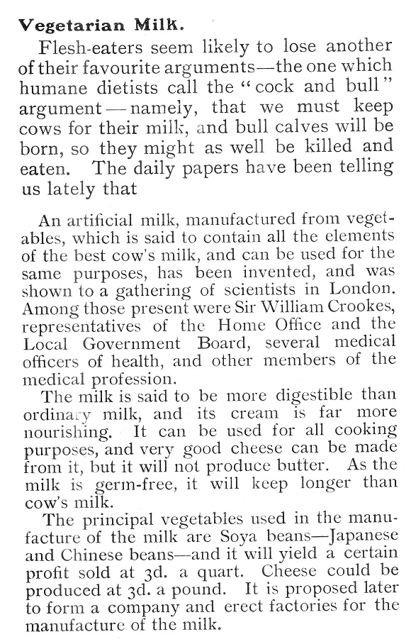 An artificial milk, manufactured from vegetables, which is said to contain all the elements of the best cow’s milk, and can be used for the same purposes, has been invented, and was shown to a gathering of scientists in London. Among those present were Sir William Crookes, representatives of the Home Office and the Local Government Board, several medical officers of health, and other members of the medical profession.