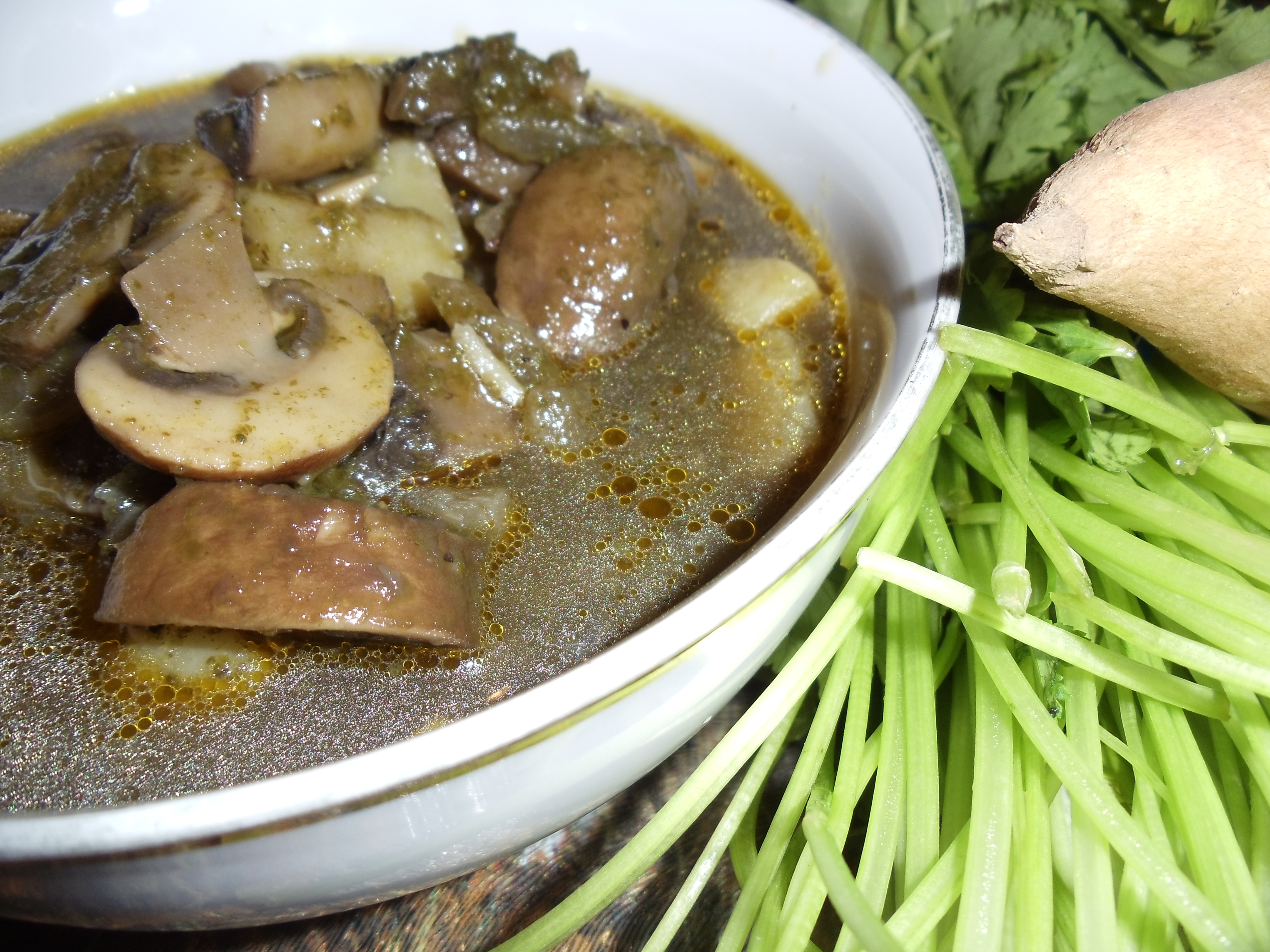 This is a variation of the traditional Peruvian Seco dish that’s contained in my cookbook, Peruvegan. I came up with this dish after pondering what type of Peruvian dish I was going to make for my gluten-free friends. This version removes the seitan (making it gluten-free), and replaces it with Portobello and Crimini mushrooms, and Japanese sweet potatoes. The dense and chewy texture of the mushrooms, along with the salty broth…