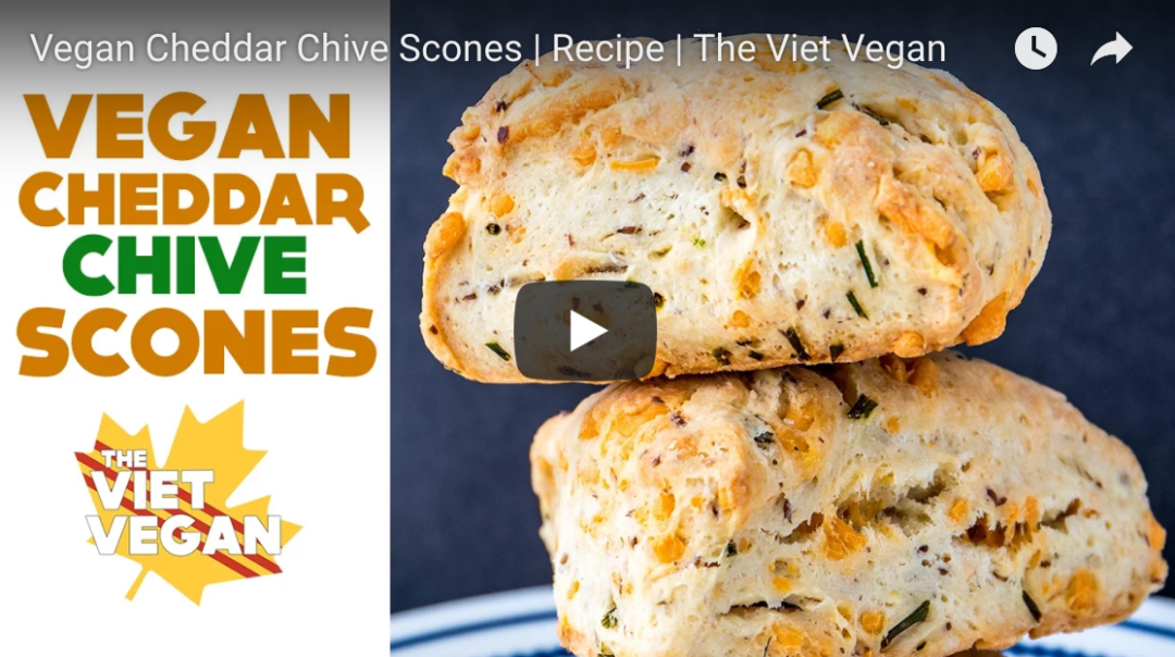 If you’re looking for something awesome to make for breakfast this weekend, look no further! The Viet Vegan has just the thing for you — buttery, flakey vegan cheddar chive scones! These are great if you like having something savory for breakfast. But don’t just limi them to breakfast! These scones would go great with a soup too. The possibilities are endless! Check out the video below to see how…