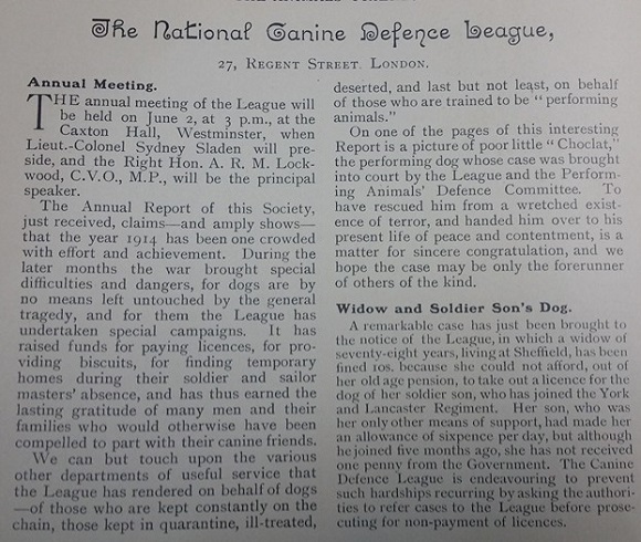 ‘Choclat’ – a dog forced to perform. He was ‘freed’ from his abusers in 1914 by the efforts of our illustrious AR predecessors.