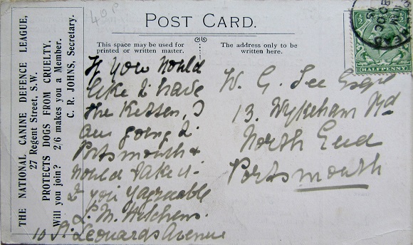 A nice addition – in 1915 ‘L. M. Hitchens’ was seemingly working on rehoming a kitten & also offering to take it to its new ‘human’ carer ‘W. G. Lee Esq.’ .
