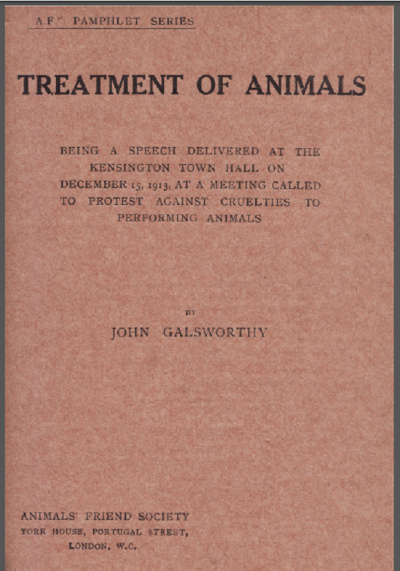 Treatment of animals : being a speech delivered at the Kensington Town Hall on December 15, 1913, at a meeting called to protest against cruelties to performing animals – by John Galsworthy – The “A. F.” pamphlet series – London :Animals’ Friend Society,[1913]. Ask us for the complete pamphlet as a 15MB .pdf file.