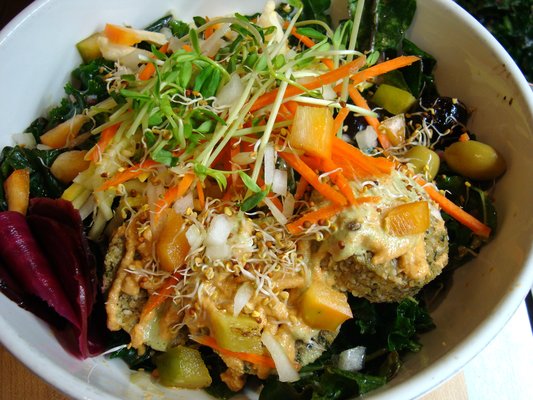 To put it all together, put a good portion of the bean salad in a bowl, then on top of that put some chopped kale and baby spinach, on top of that some pickled beets and then 3 or 4 falafel and drizzle it all with the ginger dressing. This is a delicious flavorful meal full of nutrients.
