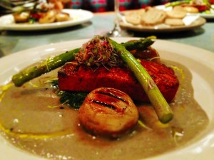 I, along with my other two friends, ordered the “Salmon” Tofu as our main course. It was a slice of grilled tofu that had been marinaded in beetroot juice. The texture and flavor of the tofu was incredibly similar to salmon and was accompanied by sauteed spinach, asparagus, “scallop” mushrooms and a mushroom thyme sauce. This dish was probably one of the best “mock meat” dishes I have ever had. I will dream about for months to come.