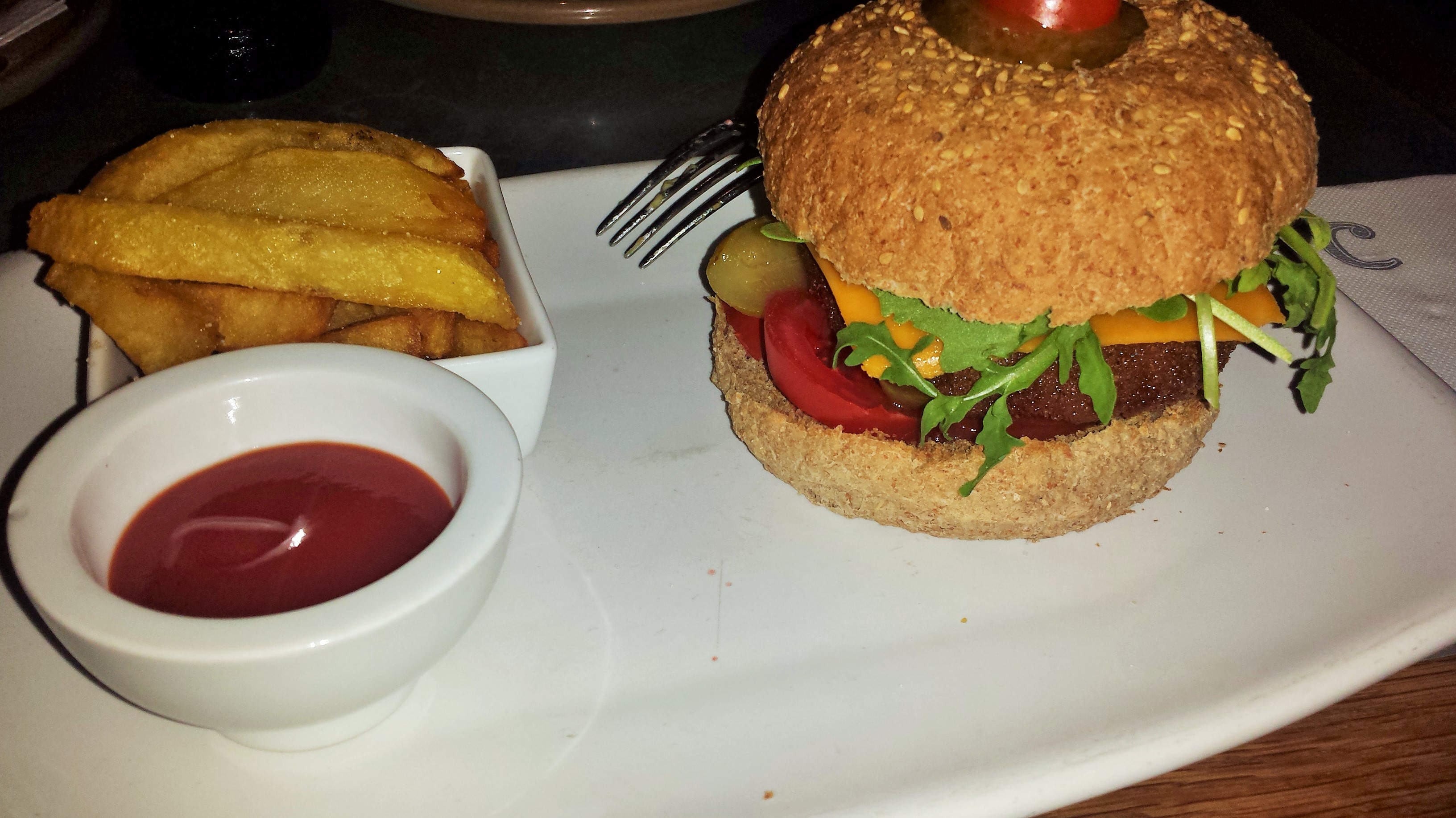 Michael ordered the Setain burger as his main dish. It was hearty, diversely flavored and came with golden crisp fries, sure to please any meat eater. Of course I sampled it and approved mightily.