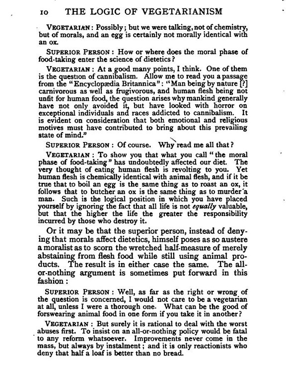 Vegetarian: To show you that what you call ” the moral phase of food-taking ” has undoubtedly affected our diet. The very thought of eating human flesh is revolting to you. Yet human flesh is chemically identical with animal flesh, and if it be true that to boil an egg is the same thing as to roast an ox, it follows that to butcher an ox is the same thing as to murder a man. Such is the logical position in which you have placed yourself by ignoring the fact that all life is not equally valuable, but that the higher the life the greater the responsibility incurred by those who destroy it.