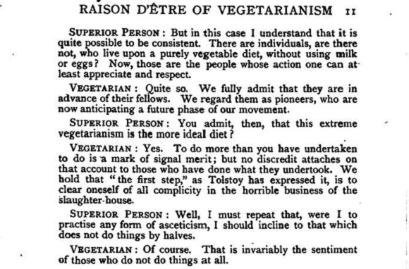Or it may be that the superior person, instead of denying that morals affect dietetics, himself poses as so austere a moralist as to scorn the wretched half-measure of merely abstaining from flesh food while still using animal products. The result is in either case the same.