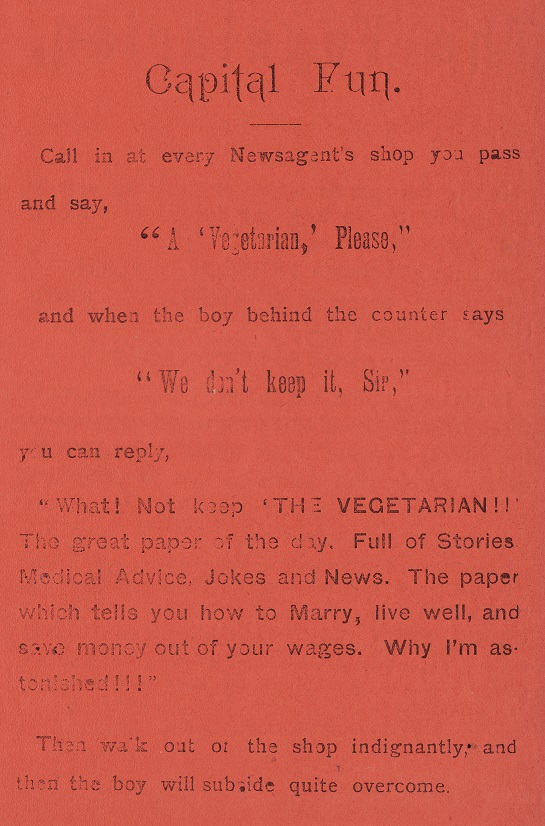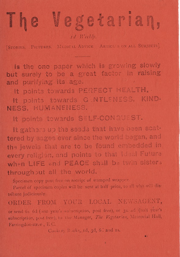 The first flyer was produced with the goal of increasing the weekly sales of The Vegetarian – an early publication of The London Vegetarian Society.