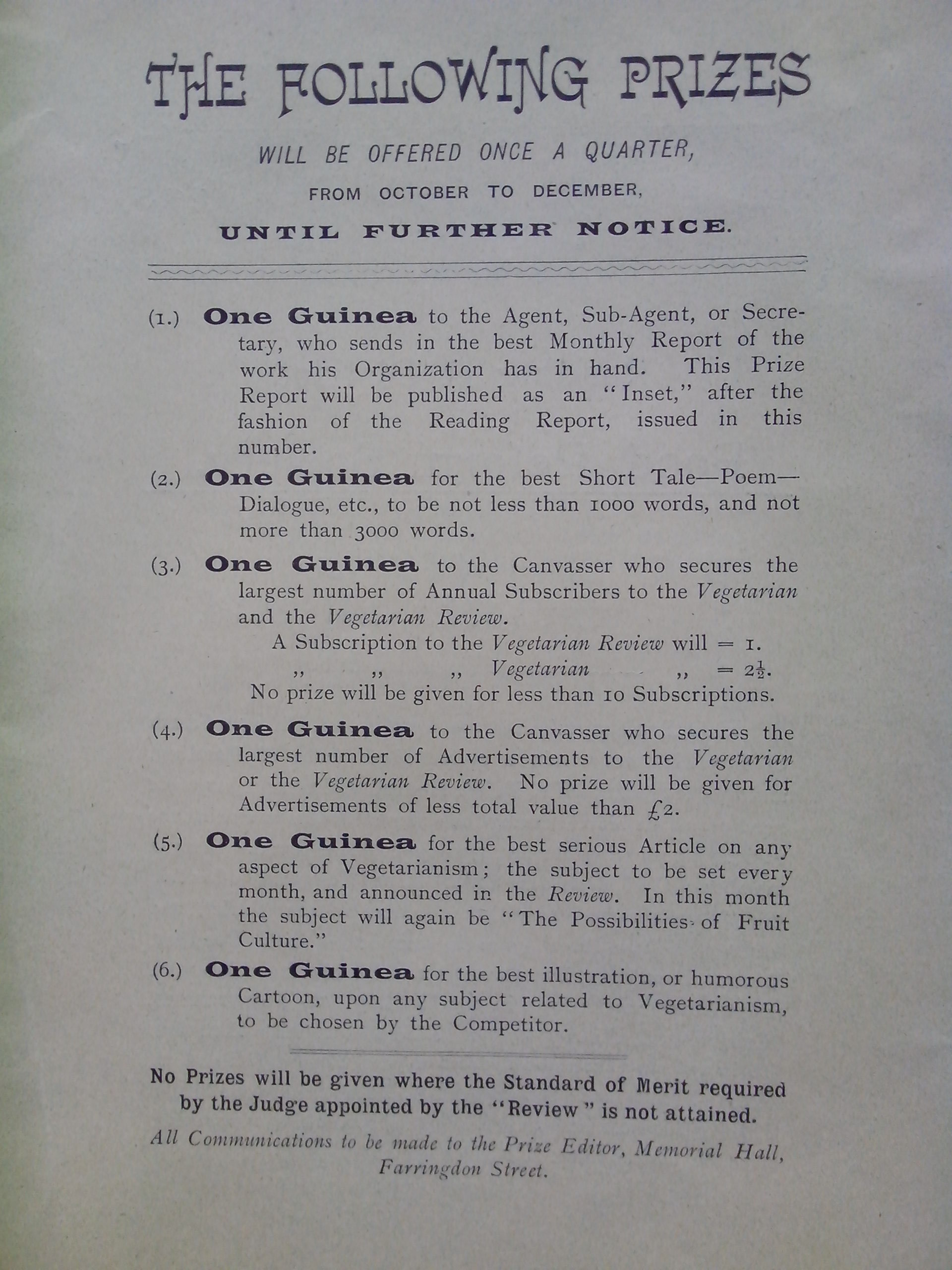 It was inserted along with this next flyer – below – which offered cash ‘prizes’ to people who sold subscriptions for, or submitted stories to, or sent in illustrations etc. to both The Vegetarian & The Vegetarian Review.