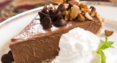 Melt chocolate chips in double boiler. Blend tofu in blender or food processor until creamy, and add melted chocolate and vanilla to blender. Blend all together until creamy. Pour mixture into pie crust. Chill in refrigerator for at least 60 minutes. Top with crumbled cookies or cut fresh fruit, or serve with a scoop of non-dairy ice cream or sorbet.