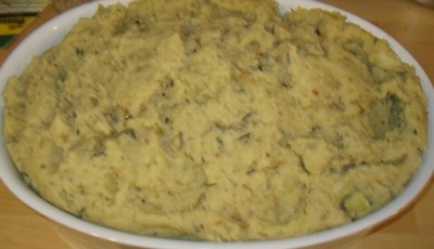 Steam or boil potatoes until soft. Place potatoes into a bowl and mash thoroughly. Add garlic, margarine or coconut oil, non-dairy milk.