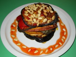 Place on a greased tray 4 slices of eggplant, spread on sweet chilli sauce and sprinkle some pine nuts on top.