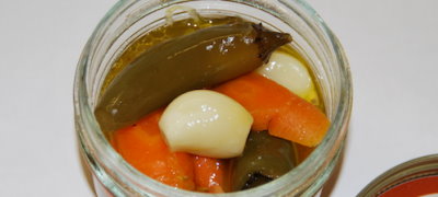 Heat oil in a large, deep skillet. Add the chillies, onions, carrots, and garlic. Fry over medium heat for about 10 minutes, turning them over occasionally.