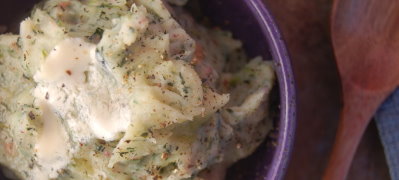 Strain the water from the pot and place the potatoes and watercress into the food processor.