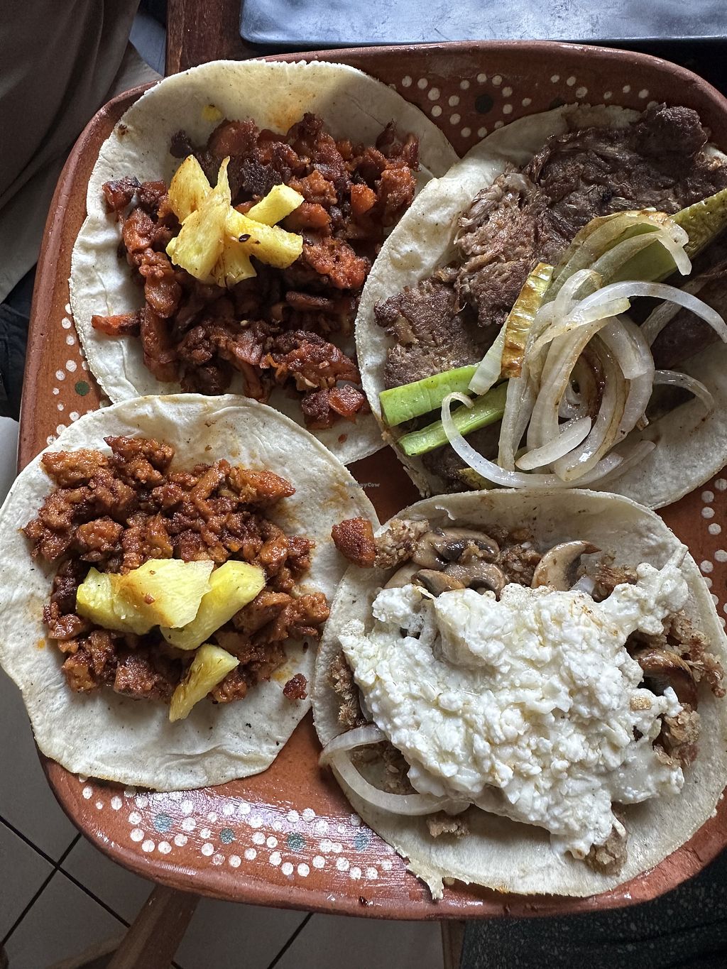 Al pastor (jackfruit/wheat), steak, and mushroom/cheese tacos 🌮