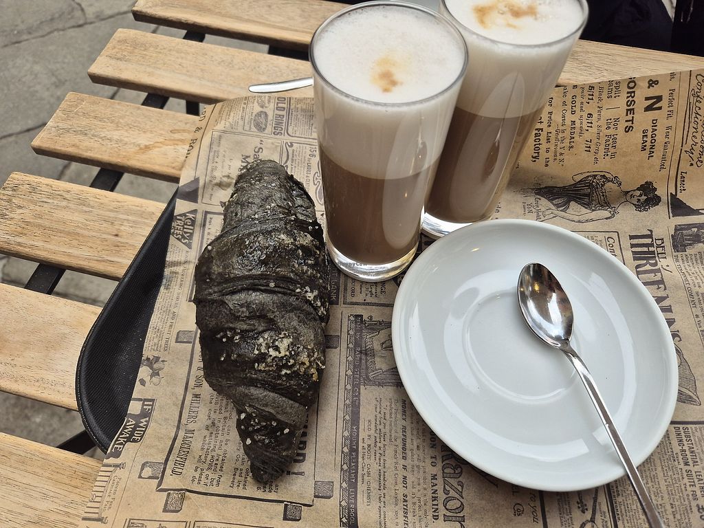 Cappuccino with soy milk, vegan croissant (in black)