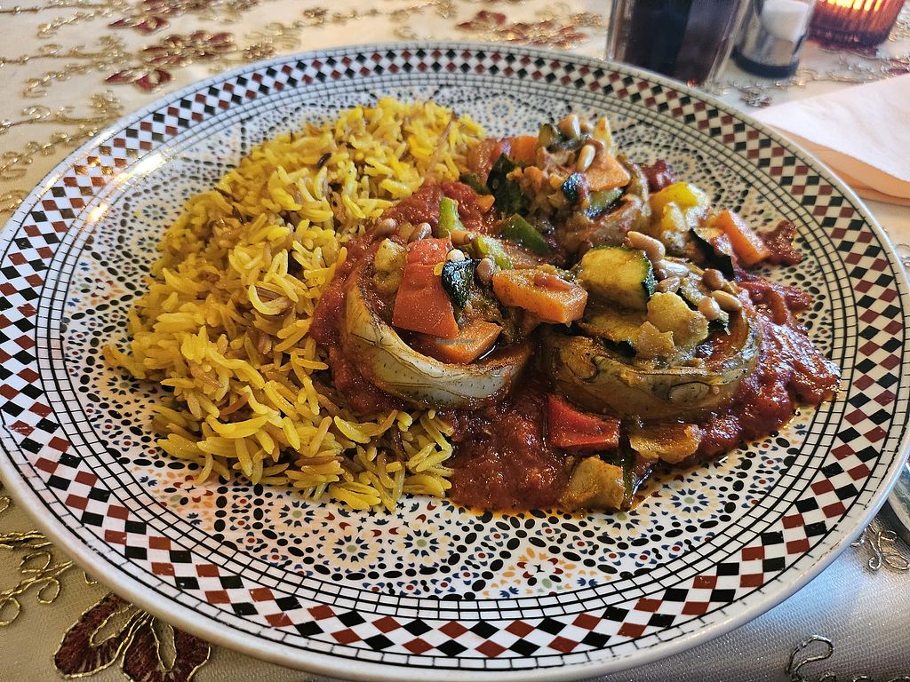 Artischoken mit Gemüsefüllung auf Tomatensauce mit Safranreis
