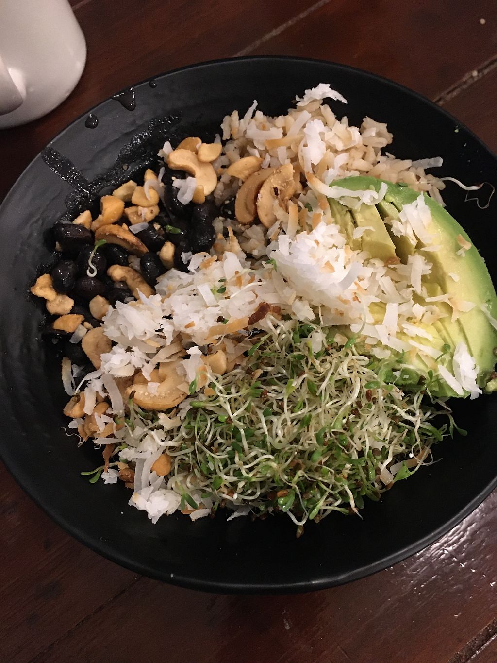 A large bowl with brown rice, carrots, alfalfa sprouts, black beans, r…