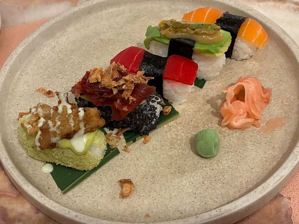 Nigiri series, L to R: Green Velvet, Citrus Beet, Toro, Crispy asparag…