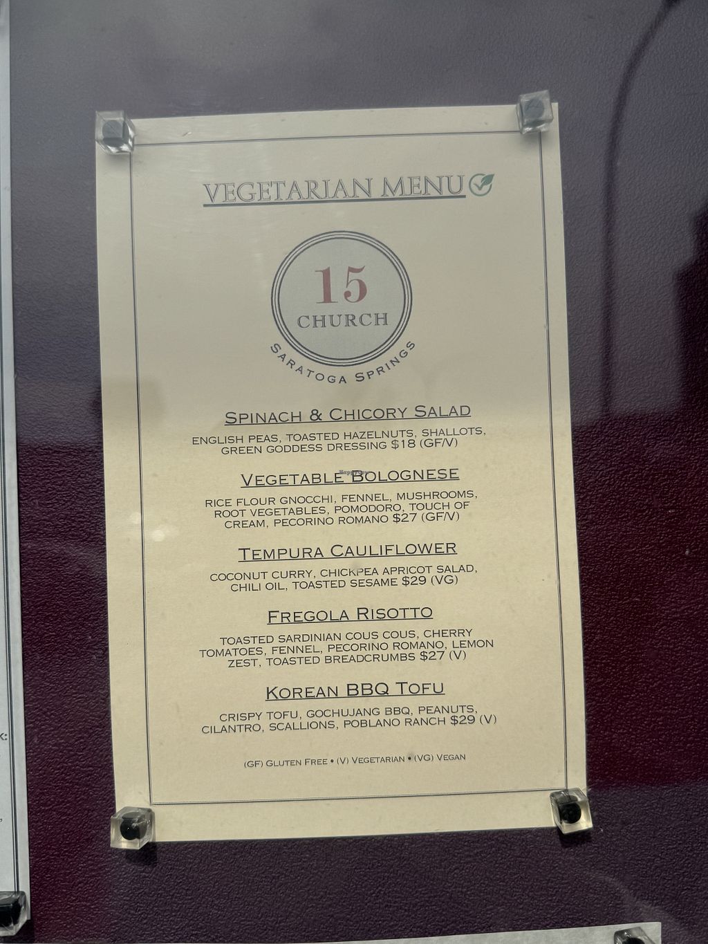 I’ve been coming to 15 Church for years and they’ve always been accommodating. I’ve been going regularly to the point where I asked for tofu and they started buying it for me. Now they have a vegan/vegetarian menu officially! All the items can be made vegan. I’m so thankful for Chef Mike for being so amazing and making this official! This is my favorite place to eat in Saratoga. Amazing atmosphere and delicious food!