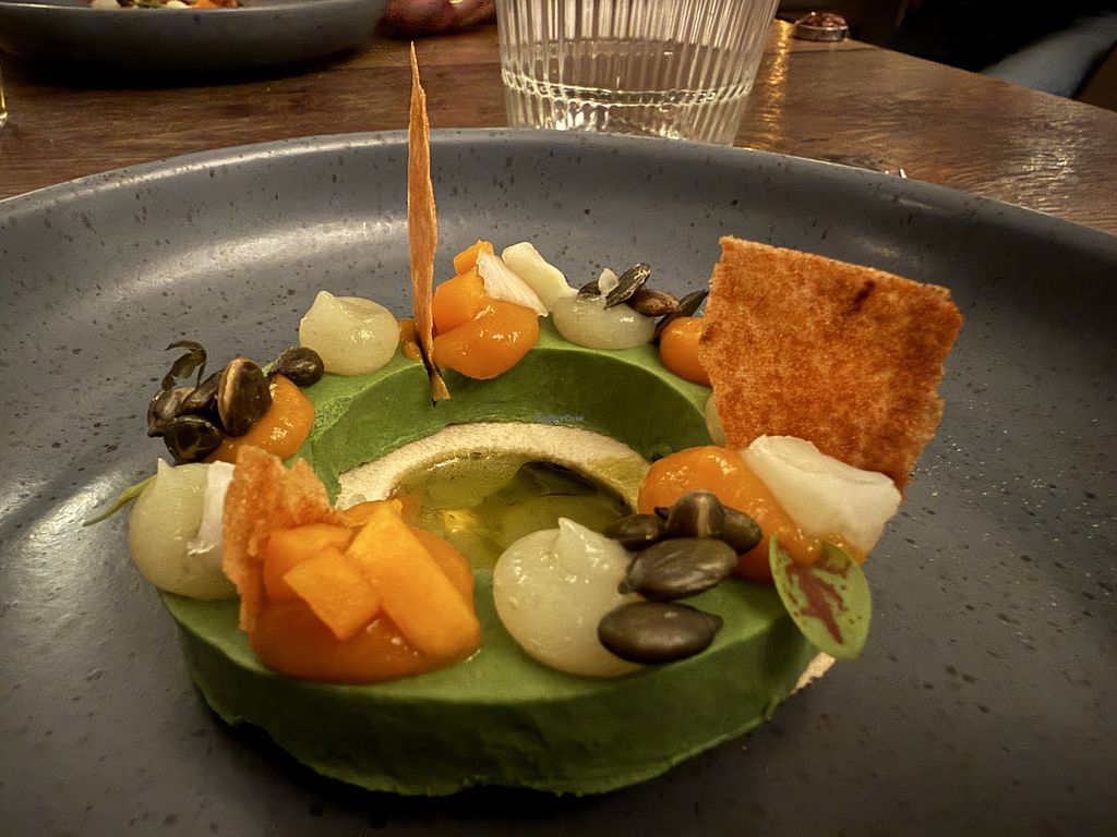 Waanzinnig voorgerecht met curryespuma, vegan schrimp & mangoazijn