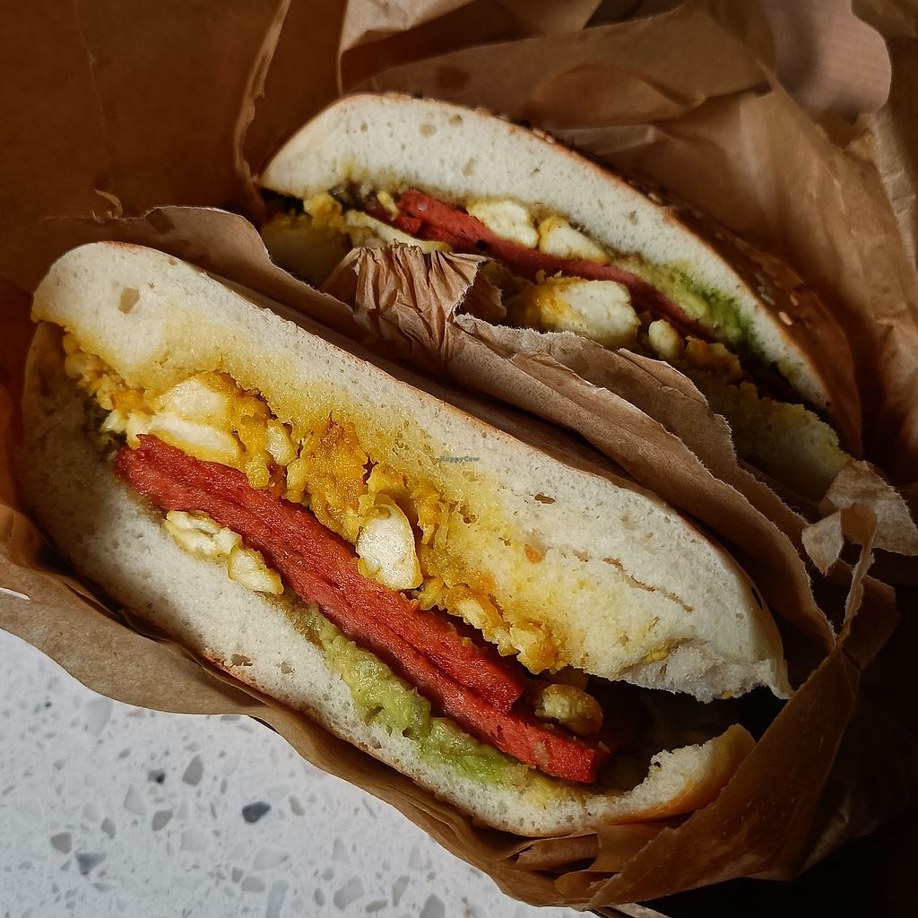 Vegan intifada kaak bagel with scrambled tofu, avo, facon