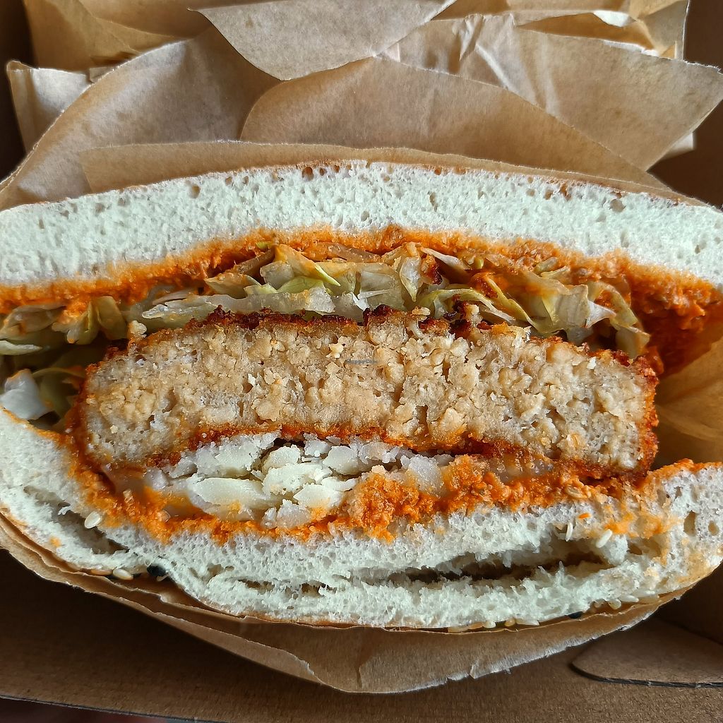Vegan chicken schnitzel, cheese, tomato pesto, lettuce!