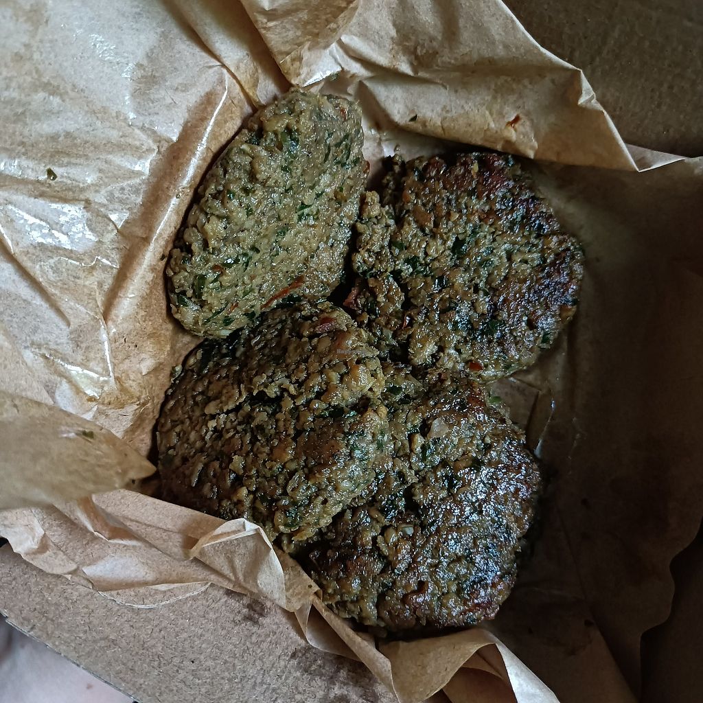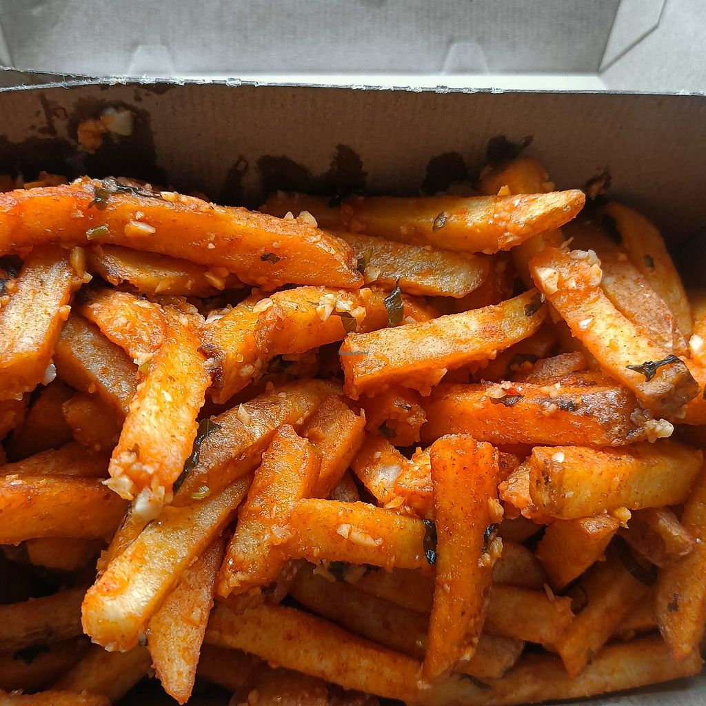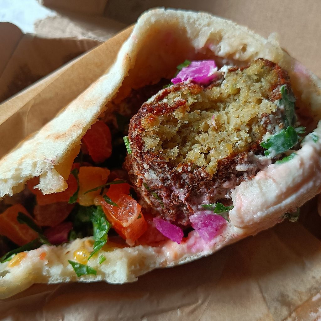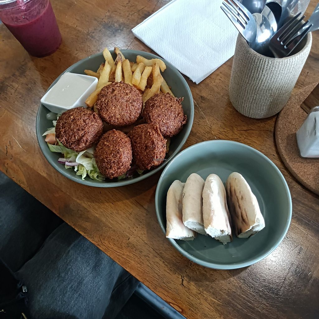 Falafel bowl (absolutely delish crispy falafel) with fries, veggie yogβ¦