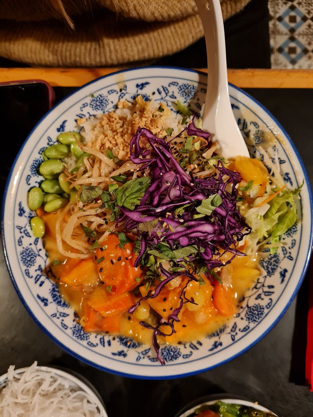 Silken tofu coated with flakes (#3), eggplant, shiitake, tofu (#6), ma…