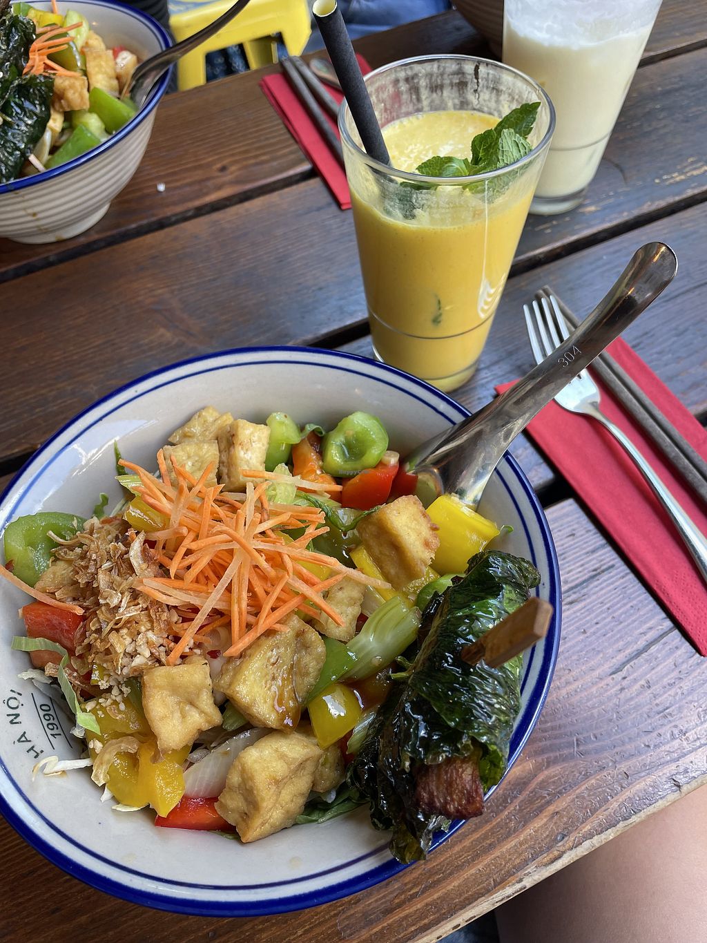 Various delicious small bowls and a mango/coconut drink
