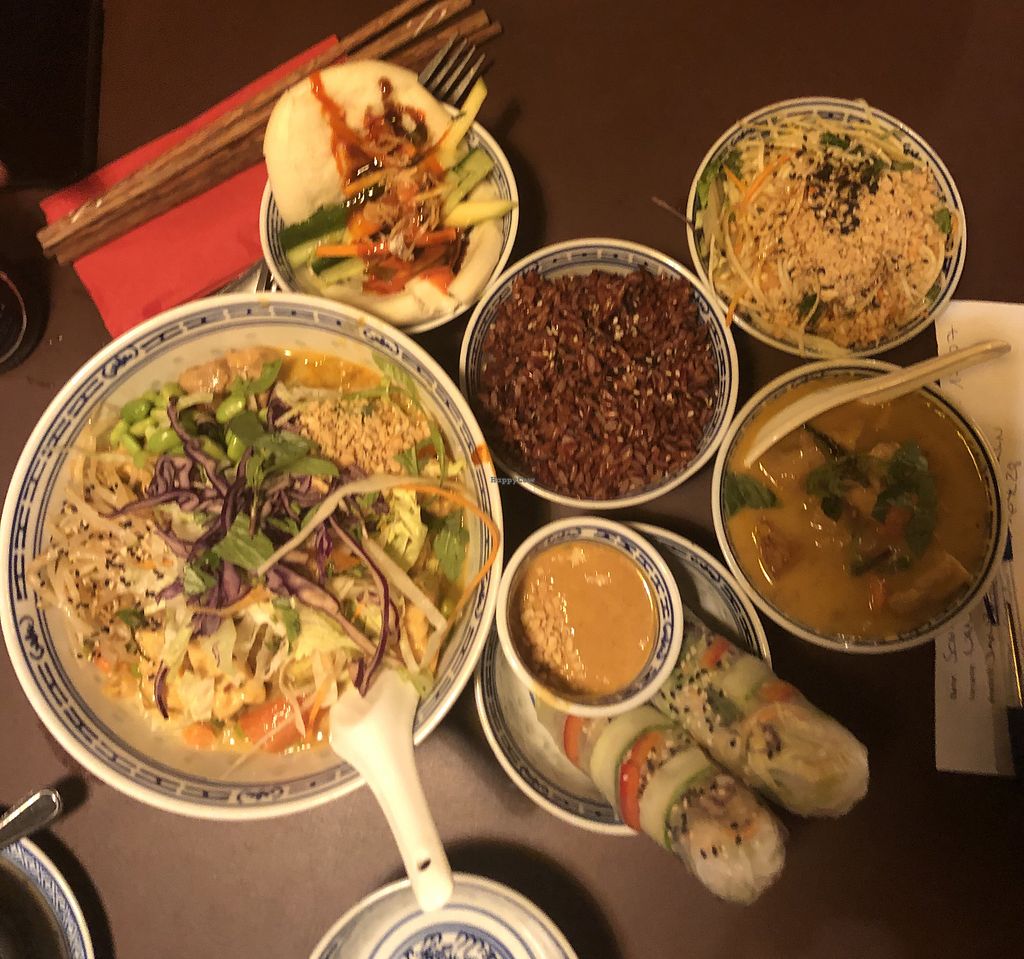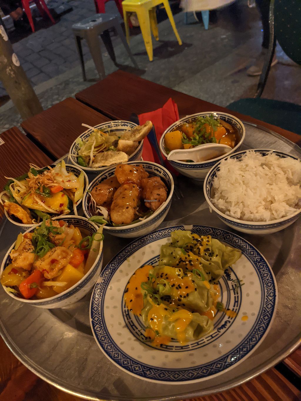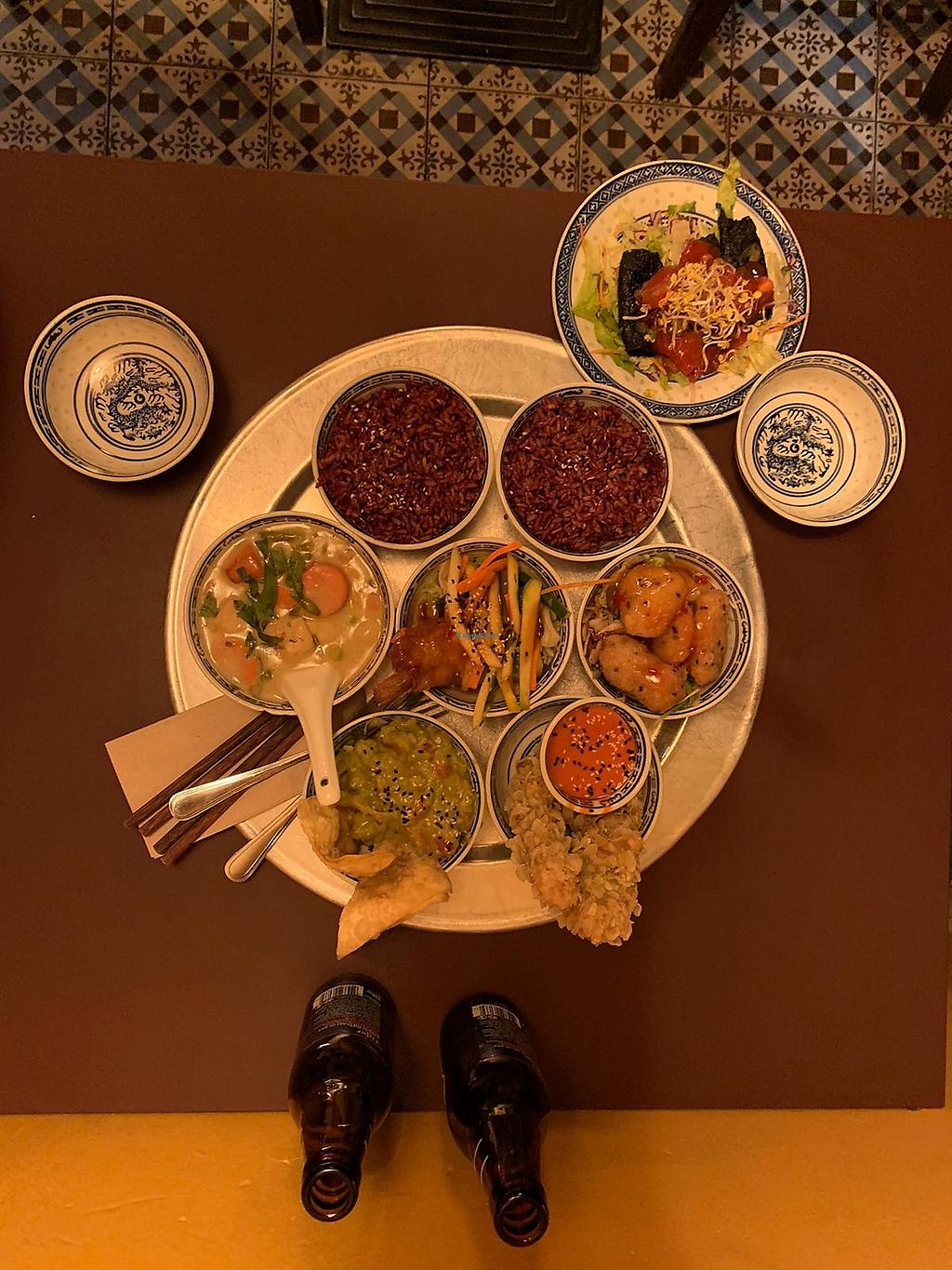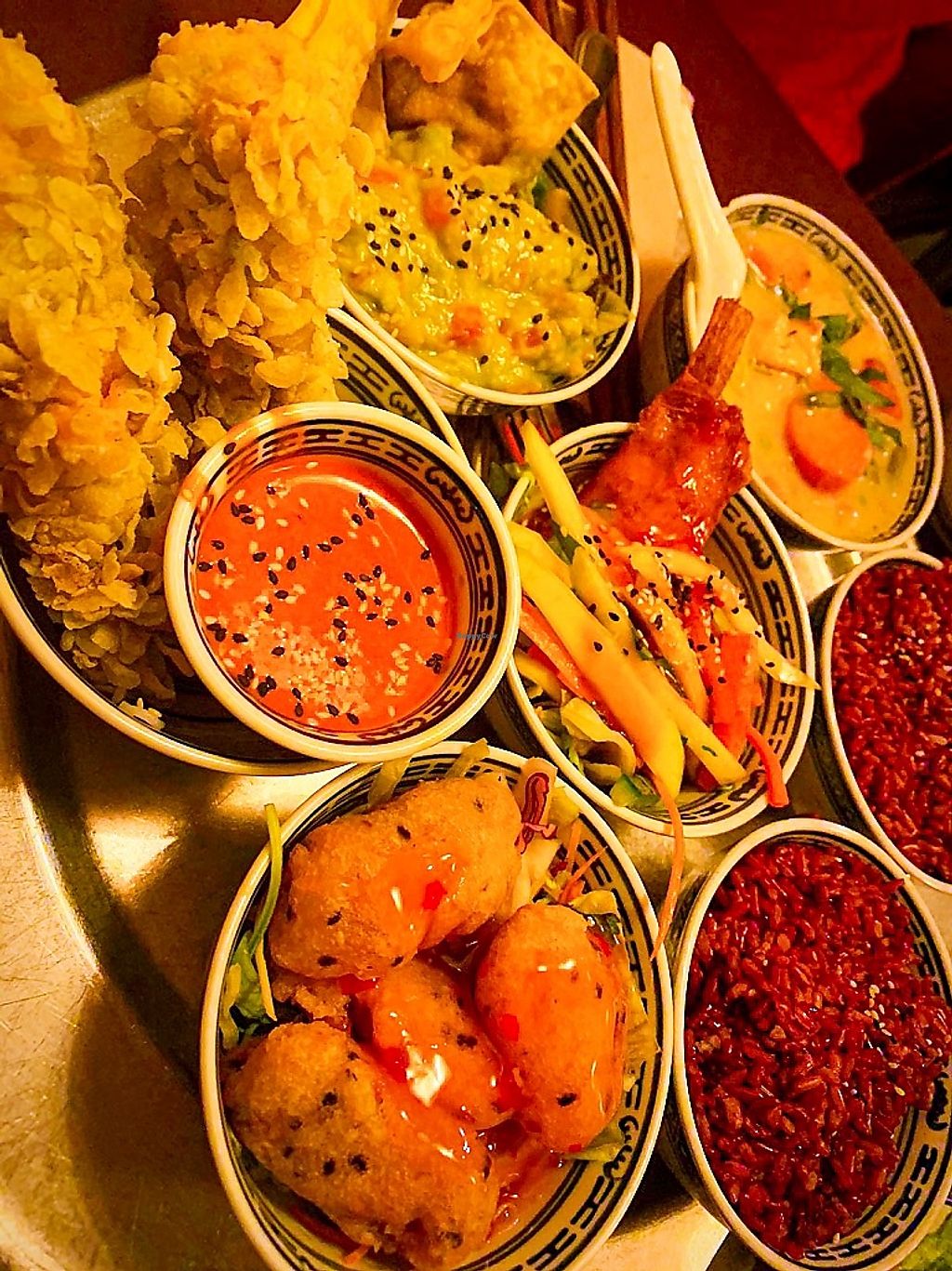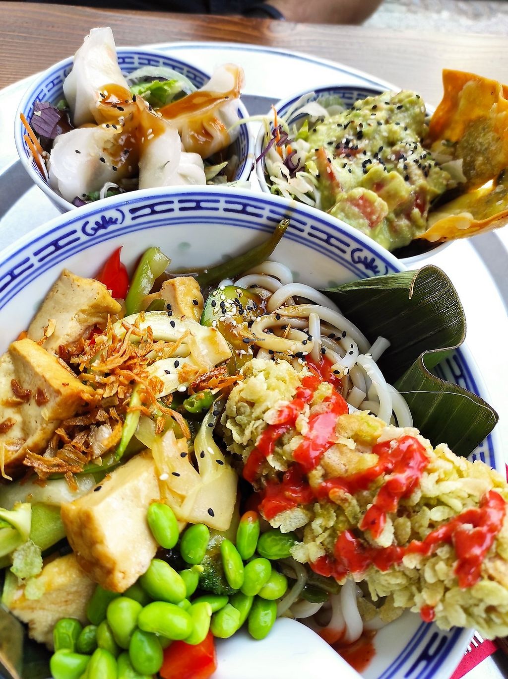 Papaya salad, guacamole & wantan, mixed vegetables and homemade tempeh